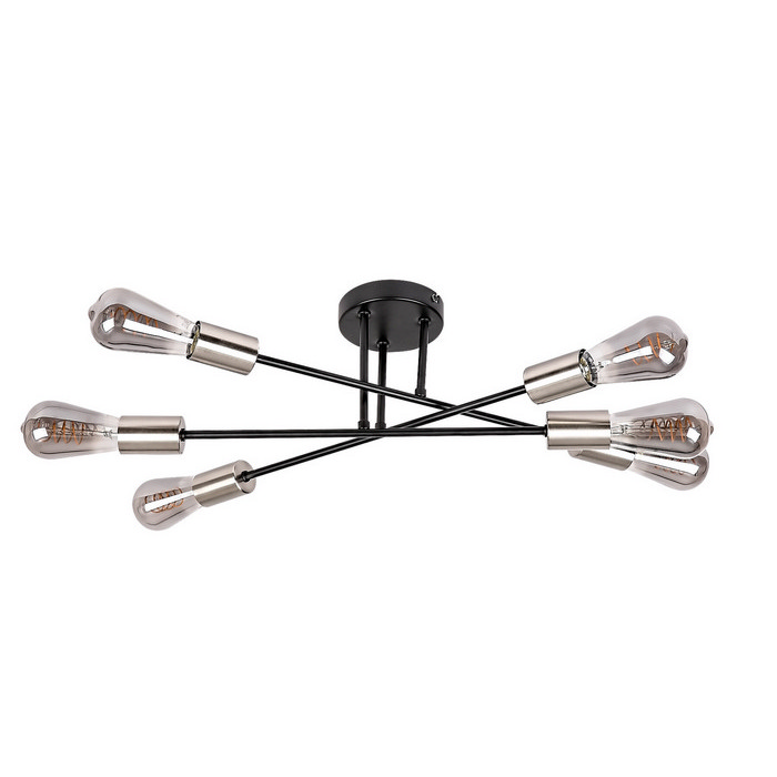 Το Branwen 6-φωτο φωτιστικό οροφής συνδυάζει τον μοντέρνο βιομηχανικό σχεδιασμό με την κομψότητα του μετάλλου, προσφέροντας μια δυναμική αισθητική παρουσία σε κάθε σύγχρονο σαλόνι. Κατασκευασμένο εξολοκλήρου από μέταλλο, εντυπωσιάζει με την αντίθεση ανάμεσα στη ματ μαύρη απόχρωση και τις σατινέ χρωμίου λεπτομέρειες, ενώ η δομή του παραπέμπει σε αφαιρετικές, γεωμετρικές φόρμες.