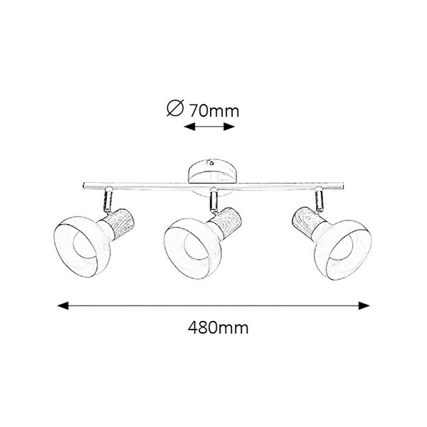 Προβολέας οροφής σκανδιναβικού στυλ με 3 υποδοχές. Μεταλλικό φωτιστικό λευκού και οξιάς πλάτους 48 cm με αμπαζούρ που τοποθετούνται και προστασία IP20. Το φωτιστικό μπορεί να χρησιμοποιηθεί με 3 λαμπτήρες εξοικονόμησης ενέργειας ισχύος έως 40W έκαστος, υποδοχές τύπου E14.