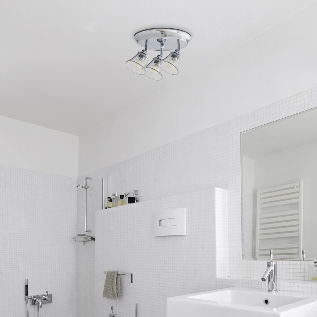 Χρώμα Καπέλων: Διαφανές – Τρία καμπανοειδή γυάλινα καπέλα που προσφέρουν διάχυτο και απαλό φωτισμό, δημιουργώντας μια ζεστή και χαλαρωτική ατμόσφαιρα στο μπάνιο.