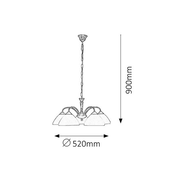 Ένας πολυέλαιος σε κλασικό στυλ με 5 υποδοχές. Το φωτιστικό με κρεμαστή αλυσίδα 90 cm και διάμετρο 52 cm είναι κατασκευασμένο από ορειχάλκινο μέταλλο με γυάλινο αμπαζούρ σε κρεμ χρώμα. Το φωτιστικό μπορεί επίσης να χρησιμοποιηθεί με 5 x πηγές φωτός εξοικονόμησης ενέργειας έως 40W, με υποδοχές E-14.