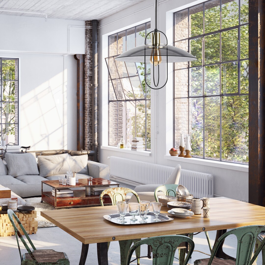 Όσον αφορά το στυλ του ανήκει στην κατηγορία των industrial. Το αμπαζούρ καλύπτει τη λάμπα ως φαρδύ καπέλο, το οποίο, ανάλογα με την επιλογή σας,